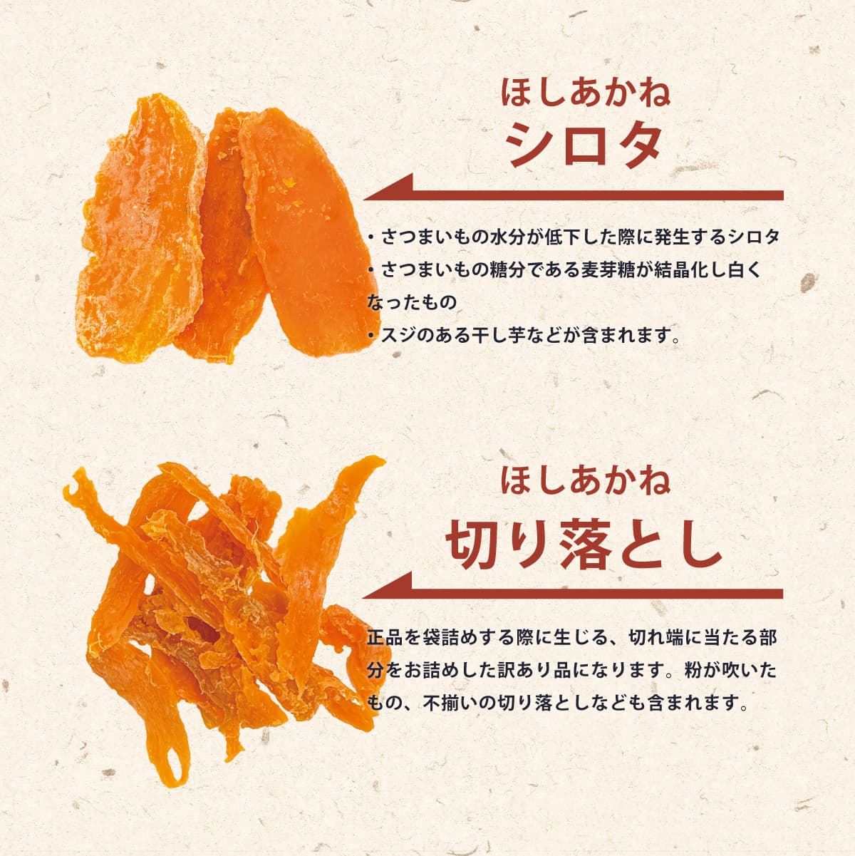 さつまいもの水分が低下した際に発生する白い部分の「シロタ」、さつまいもの糖分である麦芽糖が結晶化し白く粉を吹いたもの、スジがある干し芋などが含まれます。