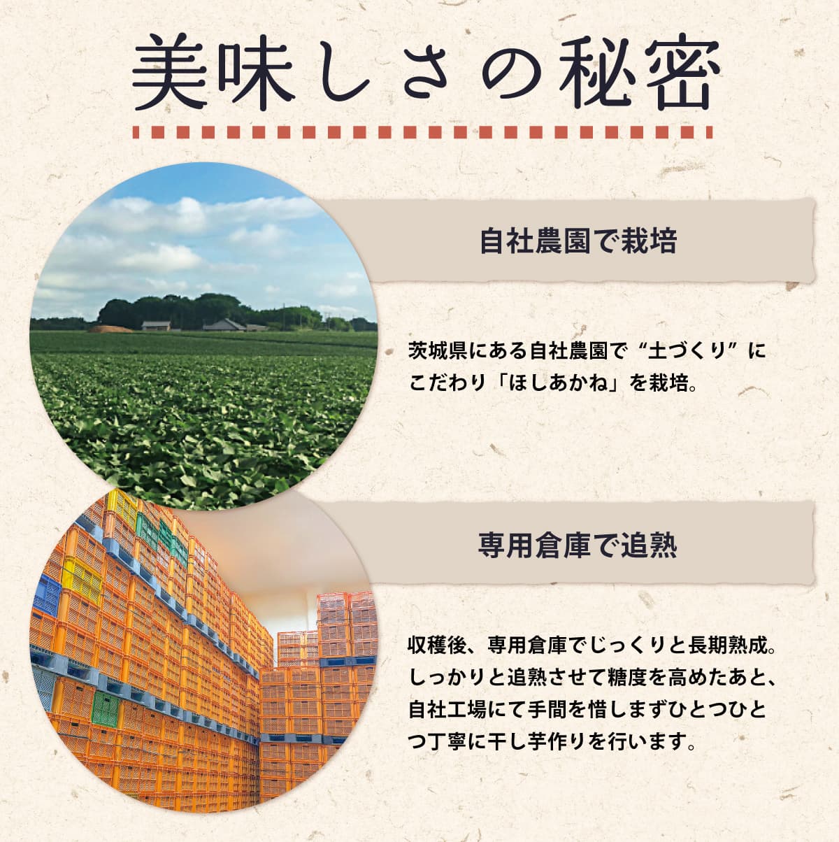 茨城県にある自社農園で栽培された「ほしあかね」を使用した干し芋です。
